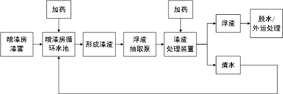 喷漆房喷漆工作中产生的漆雾由循环水吸收,在循环水池中添加药剂使漆雾和水分离,形成漆渣,一般情况下漆渣的比重比水轻,漆渣上浮于水面,通过浮渣抽取泵抽入漆渣处理装置,再次加药絮凝形成大块漆渣,通过处理装置中的专利产品间歇气浮使漆渣浮在表面,方便刮渣装置刮走集中处理。清水则回到喷漆房循环水池。形成水循环后机器自动运行,只需定时巡查,无需专人值守。